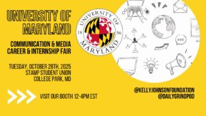 Kelly Johnson Foundation Booth at the UMD Communication & Media Internship/Career Fair Thursday, October 29th12pm – 4pm EST Public Event at The Stamp (Colony Ballroom, Stamp Student Union) University of Maryland, College Park, MD The Kelly Johnson Foundation will be hosting a booth at the UMD’s Communication & Media Career & Internship Fair! We will be sharing our full-time, part-time and internship positions in fields spanning communication, media, entertainment, marketing, production and more. We hope to connect with talented undergraduate and graduate students as well as alumni seeking opportunities. This fair is co-sponsored by the University Career Center & The President’s Promise and the Department of Communication.